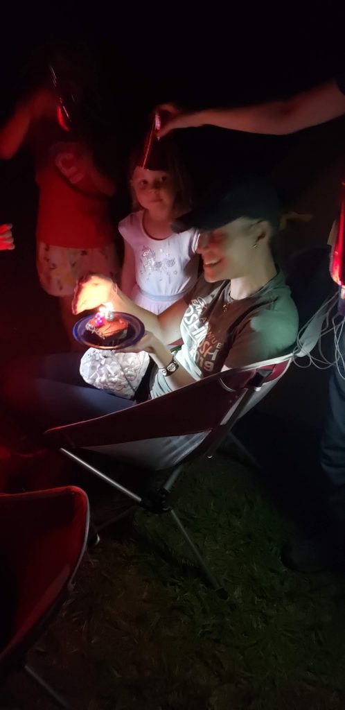 This year Karrie’s birthday fell during Sun N Fun.  As she is far smarter than I am it is very hard for me to surprise her.  I enlisted Brandi’s help and asked her if she could bring some party supplies I would order to their house with them.  She insisted on baking a cake instead!  Woo-Hoo!  Karrie was shocked when they pulled that cake out of their airplane.  My dad, Cris, and younger sister made a guest appearance for the Wednesday night airshow and birthday party.  They drove down and loaded a wagon to trek across the show grounds to HBC.  It was an excellent evening.