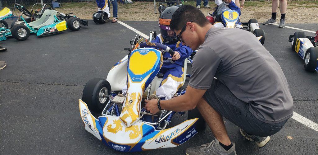 Getting fitted to the kart.