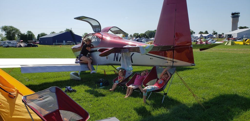 After flying the ’68 Cherokee 140 (no autopilot, steam-gauge ship with a cruise speed around 100 knots) to Oshkosh from Orlando in 2018 I was really excited to take the wife and kids to Oshkosh in the RV-10. We loaded up the plane and took off from Kissimmee. Unfortunately Oshkosh received a bunch of rain and shut down arrivals. During lunch at Bigun’s BBQ in Talking Rock, GA Karrie talked to Brandi in Atlanta and we decided it best to drop back to Atlanta where Brian and Brandi live and spend the night. They were kind enough to find us hangar space and pick us up from their airport. We did hit a little rain after landing but otherwise the flight was uneventful. They are super nice people and we had a great time hanging out at their place. The following day we took off for the north. We stopped in Burlington, WI (KBUU) and got a ride off-field to get some lunch and ice cream. Had a nice walk back to the airport before loading up in the plane to find an airport closer to Oshkosh to setup camp for the night. We found Dodge County (KUNU) and setup the tent. The arrivals were hit or miss into Oshkosh and it seemed best to wait it out for a sure thing. That night we did watch what seemed like a hundred Cessnas depart Dodge County for a mass arrival into Oshkosh. The following morning we got into Oshkosh and got a great spot at the (close) end of a row in homebuilt camping. The kids enjoyed the airshow and had lots of fun at Kidventure. They also enjoyed the EAA museum. All in all our time went really fast and it was time to load up and head home. We stopped by to see some family in Iowa before making the trip back to Florida.
